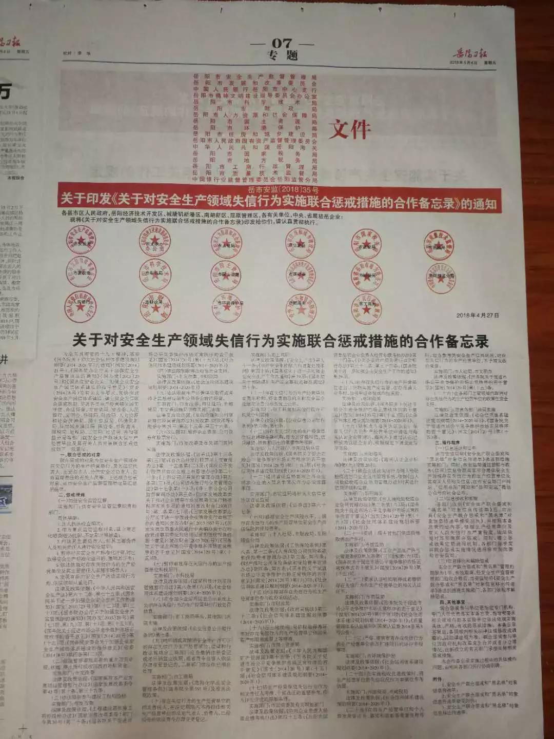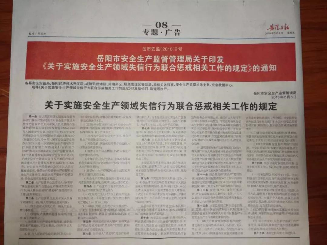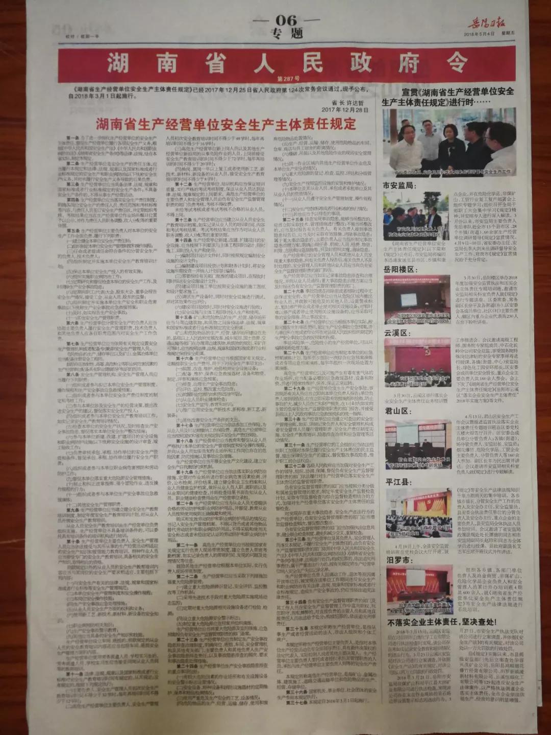 | 5月4日,《岳阳日报》利用两个整版和一个半版全文刊发了《湖南省生产经营单位安全生产主体责任规定》(湖南省人民政府令第287号)、市安监局等17个部门联合印发的《关于对安全生产领域失信行为实施联合惩戒措施的合作备忘录》(岳市安监〔2018〕35号)、市安监局《关于实施安全生产领域失信行为联合惩戒相关工作的规定》(岳市安监〔2018〕 9号),这是市安监局全面宣传安全生产领域新规政策,督促生产经营单位严格履行安全生产主体责任的一个重要举措。